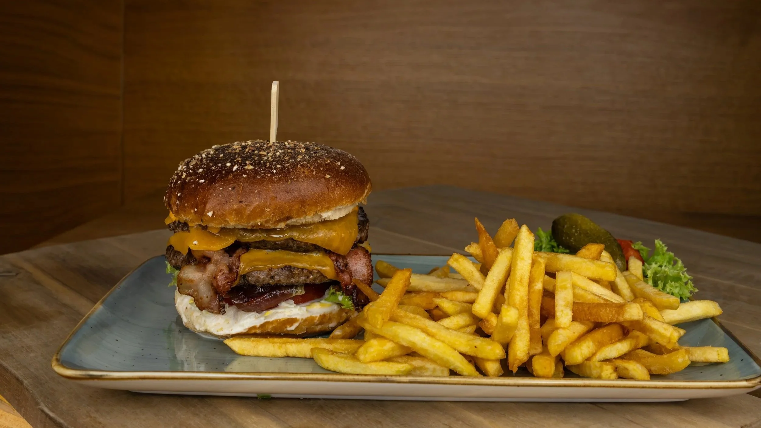 Doppelt Rinderfleisch, knackiger Salat, frische Tomaten, Coleslaw, Burger-Sauce&Senf, Bacon, doppelt Cheddar, geschmorte Zwiebeln.