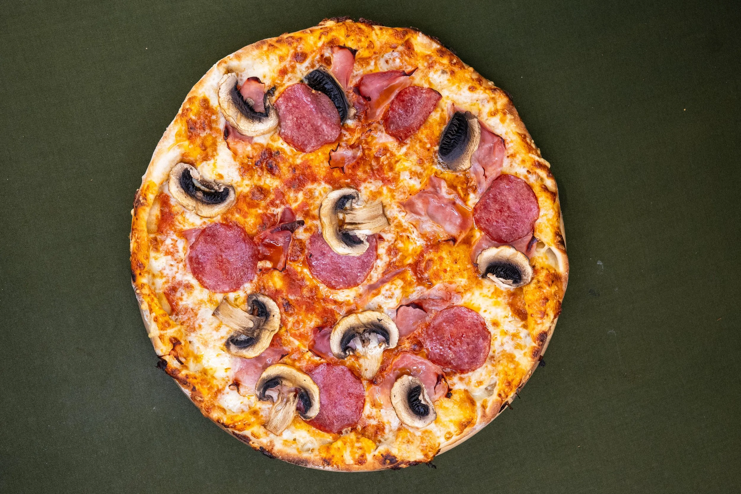 Peperoniwurst (2,3), frische Champignons, Schinken, frische Paprika, Peperoni